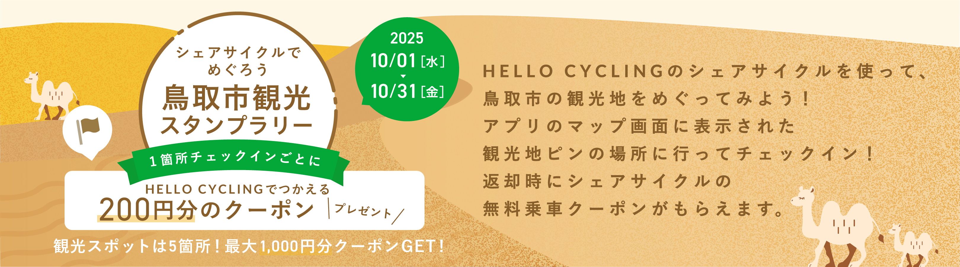 ・特典付与対象か否かの判断は、キャンペーン期間中[2025/10/1(水) 11:00~2025/10/31(金) 17:00] に、HELLO CYCLINGアプリにて、キャンペーン対象観光地にてチェックインを行い、正常にご返却いただいた方が対象になります。