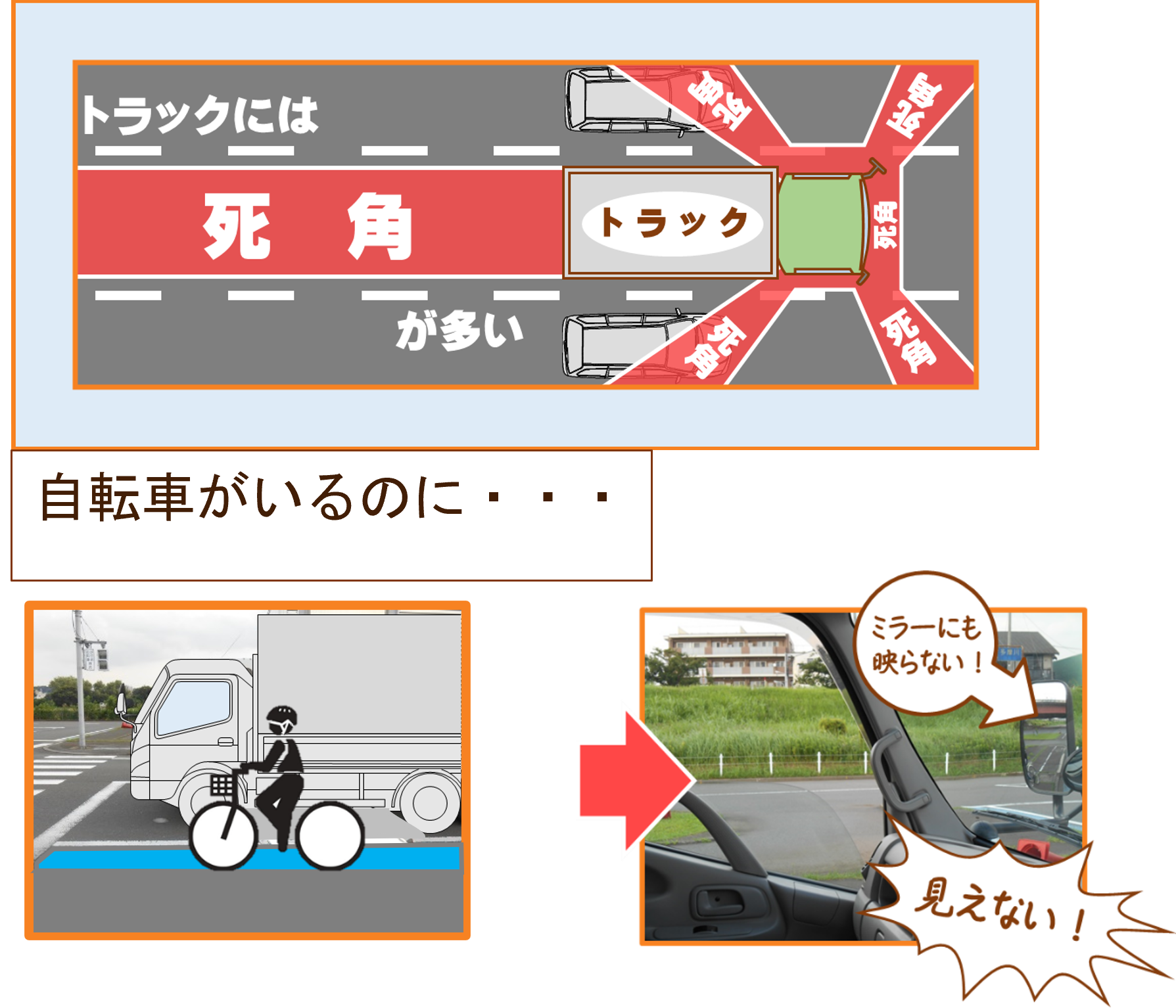 トラックは、普通車に比べ、「死角」が多く、運転席から近い場所や後方は、ドライバーから見えていません。交差点付近でトラックを追い抜く際に「死角」に入ってしまったために、左折しようとするドライバーから認識されずに巻き込まれて衝突してしまう重大事故が発生しています。