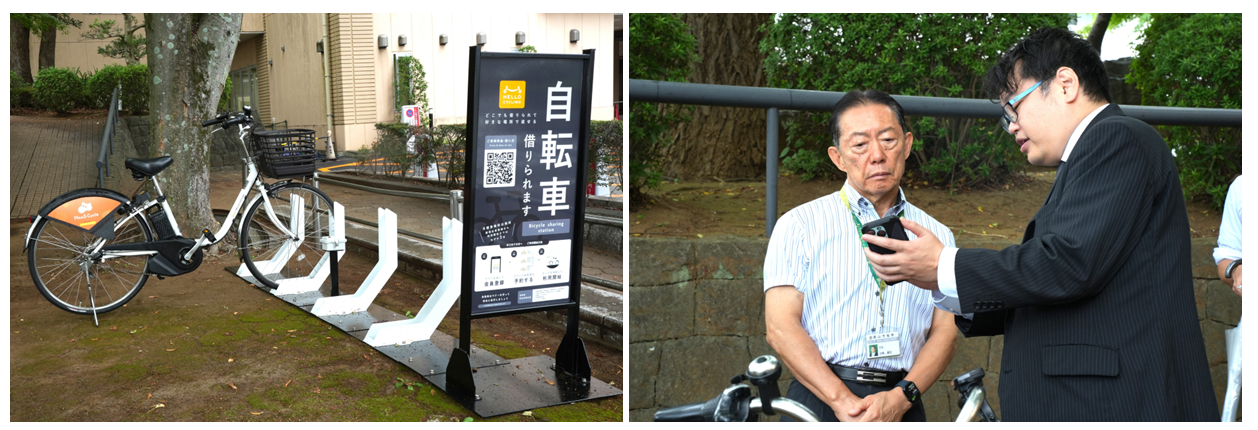 10月1日(水)、流山市役所で本事業のオープニングイベントを実施しました。協定締結後、流山市役所に設置されたステーションで、OpenStreetの工藤代表が井崎市長にHELLO CYCLINGのアプリの利用方法を説明しました。その後、実際に井崎市長がHELLO CYCLINGの自転車を試乗し、「電動アシストが効いて乗り心地が良い。アクティブなシニア層の足としても期待できるので市としても広報していきたい」と、好評をいただきました。