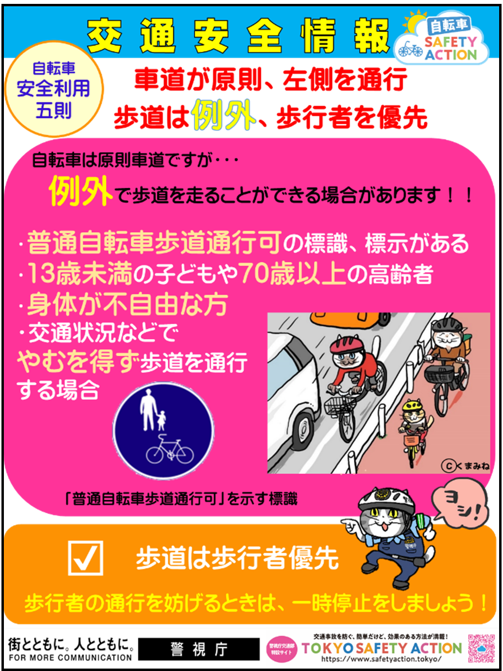 こんにちは、警視庁交通部です。皆さん、自転車は車道通行が原則ですが、場合によっては安全のため、歩行者に気を付けて歩道を通行することもできます。